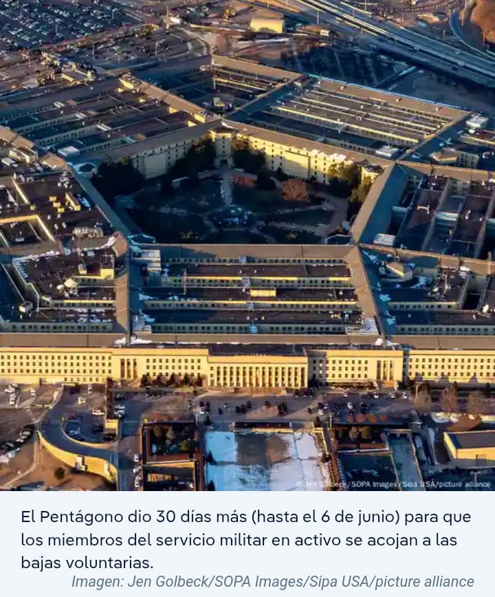 El Pentágono ha dado 30 días más (hasta el 6 de junio) para que los miembros del servicio militar en activo se acojan a esas bajas voluntarias y 60 días más (hasta el 7 de julio) a los reservistas, y planea procesar «separaciones involuntarias después de esos periodos».