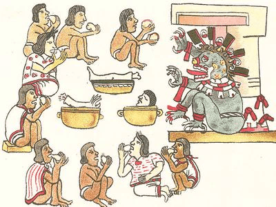 Harris: «La principal fuente de alimento de los dioses aztecas estaba constituida por los prisioneros de guerra, …, eran cogidos por cuatro sacerdotes, extendidos boca arriba sobre el altar de piedra y abiertos de un lado a otro del pecho con un cuchillo de obsidiana.»