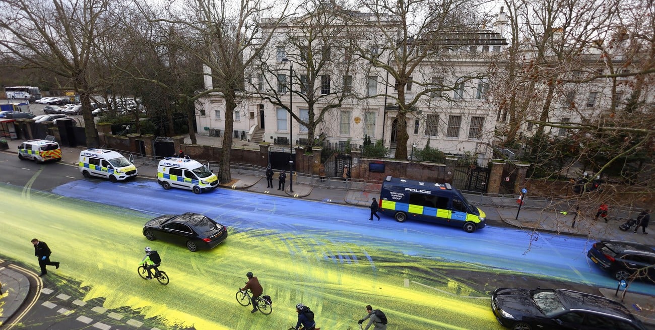 Cuatro activistas del grupo Led By Donkeys fueron detenidos tras pintar la calzada con los colores de la bandera de Ucrania ante la embajada rusa en Londres. Armados con carretillas, los activistas descargaron 170 litros de pintura azul y amarilla hasta ocupar una superficie de casi 500 metros cuadrados, surcada por el rojo de los autobuses de dos pisos en ambas direcciones.