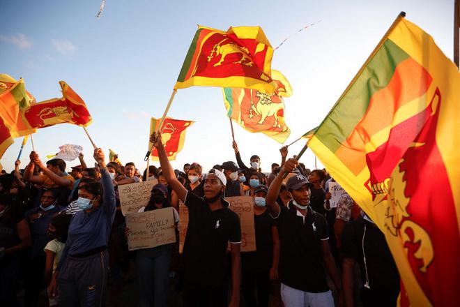 Los manifestantes celebran después de ingresar a la Secretaría Presidencial durante una protesta, luego de que el presidente Gotabaya Rajapaksa huyera, en medio de la grave...