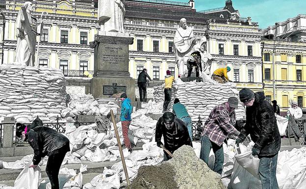 Mientras las delegaciones de Ucrania y Rusia se dan cita en Turquía para seguir con el proceso negociador, un grupo de voluntarios llena sacos con...