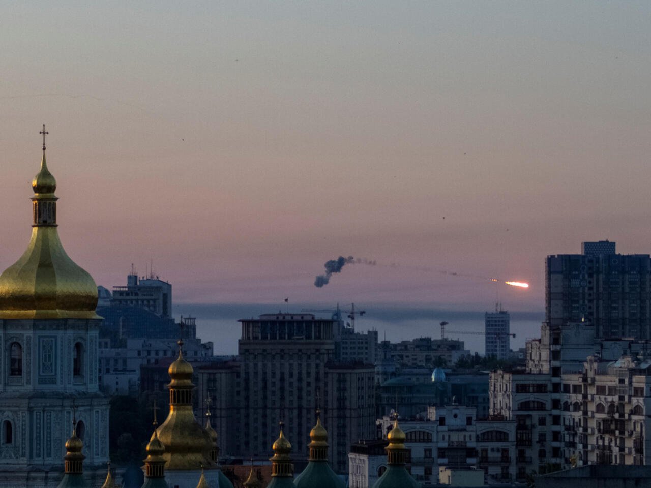 Se observa en el aire la explosión de un misil sobre Kiev, capital de Ucrania, durante un asalto “sin precedentes”, denunció la administración militar de la...