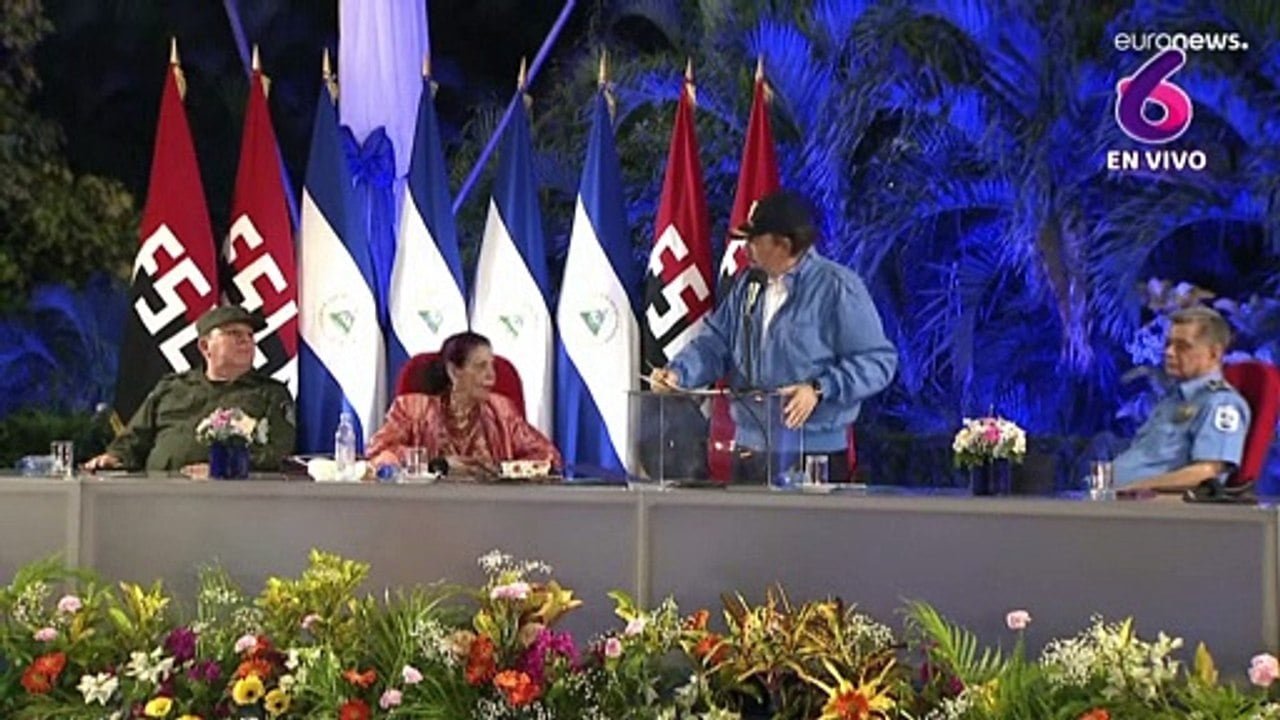 Daniel Ortega durante su discurso en el 43 aniversario de la Policía Nacional del país. Daniel Ortega arremete contra la Iglesia Católica y asegura que esta...