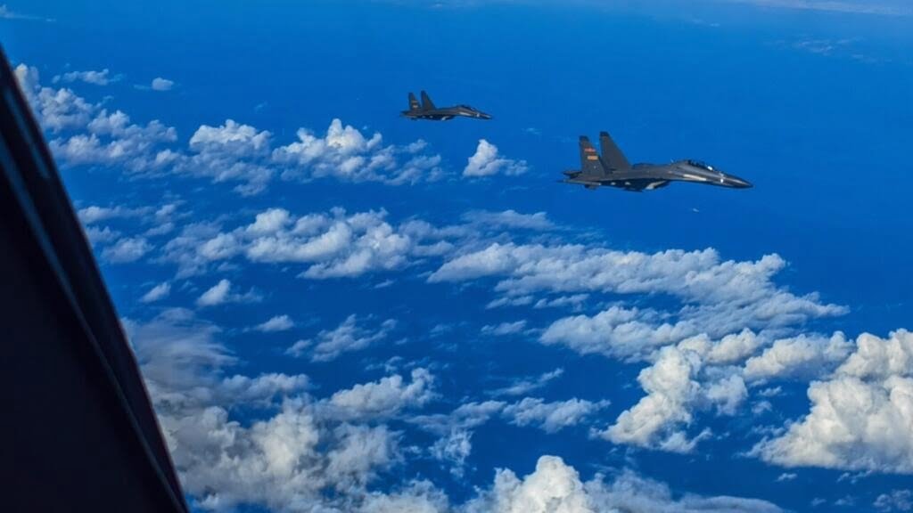 En esta foto publicada por la Agencia de Noticias Xinhua, aviones de combate del Mando del Teatro Oriental del Ejército Popular de Liberación (EPL) chino realizan...