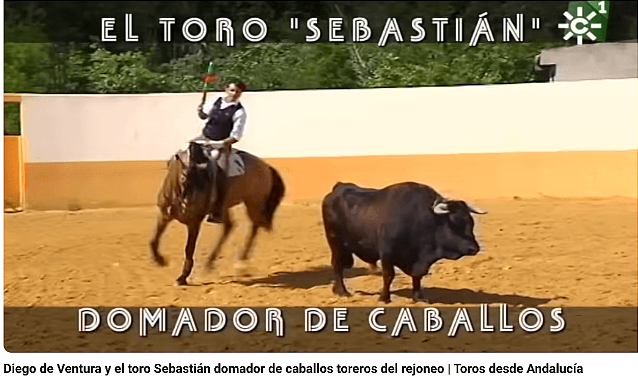 Toros para todos presencia el entrenamiento del rejoneador Diego Ventura con su toro domador de caballos en su finca de la Puebla del Río (Sevilla, Andalucía, España). Se llama Sebastián, tiene diecisiete años y es el profesor de los caballos toreros de Ventura y el domador de caballos rejoneadores tan famosos como Sueño, Dólar o Nazarí. Su labor es esencial para el espectacular rejoneo sin riendas y a dos manos de Ventura. El toro decano de la casa de Ventura fue criado a biberón pero es bravo. Magnífico toro bravo Sebastián entrenando a Bronce el precioso caballo de salida de Diego Ventura. Interviene Diego Ventura (rejoneador).