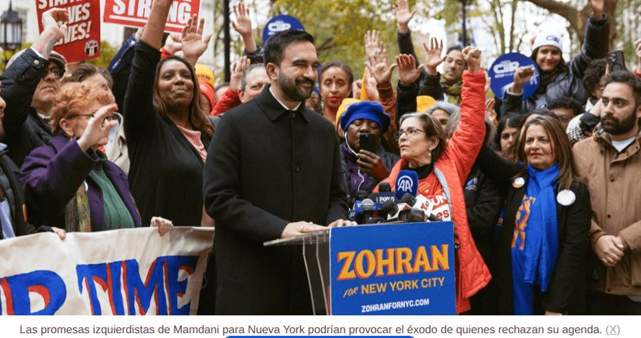 La distancia en las encuestas de Mamdani sobre Cuomo también está acortándose. De los 20 puntos de ventaja que registraba la Universidad de Suffolk a mediados de septiembre, la brecha se redujo a un solo punto. Así lo demuestra la firma AtlasIntel, cuyo sondeo más reciente refleja 43,9 % de voto estimado para Mamdani frente al 39,4 % para Cuomo. Sin embargo, ante la posibilidad de que el candidato, denominado a sí mismo como «socialista democrático», resulte electo, Nueva York podría ser lugar de emigración masiva.