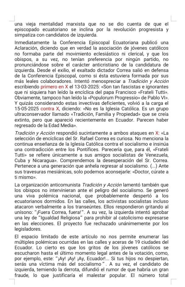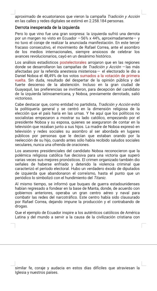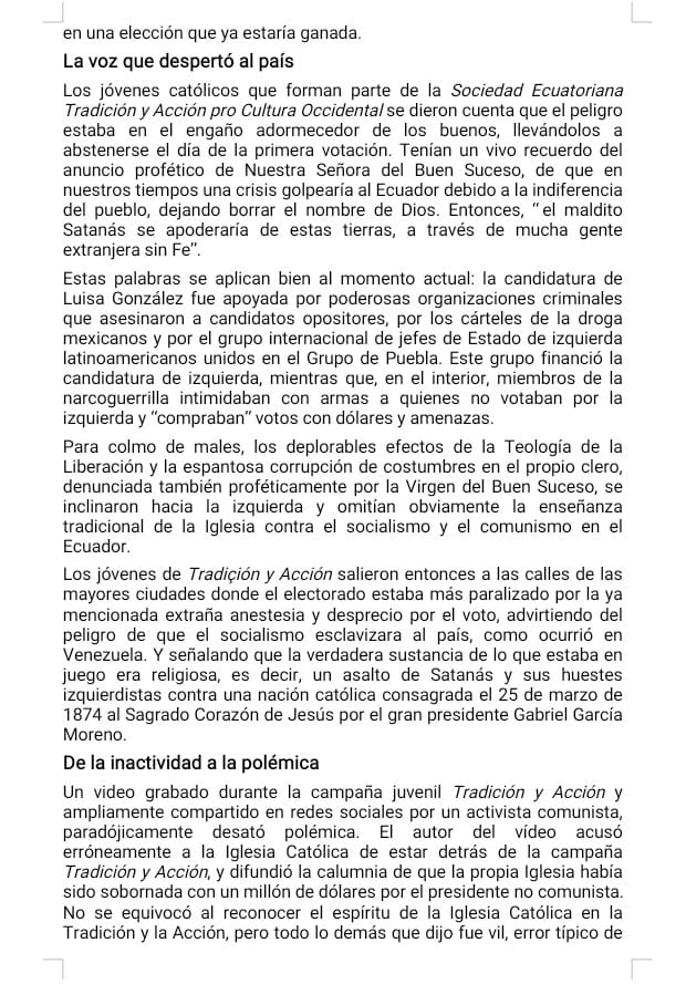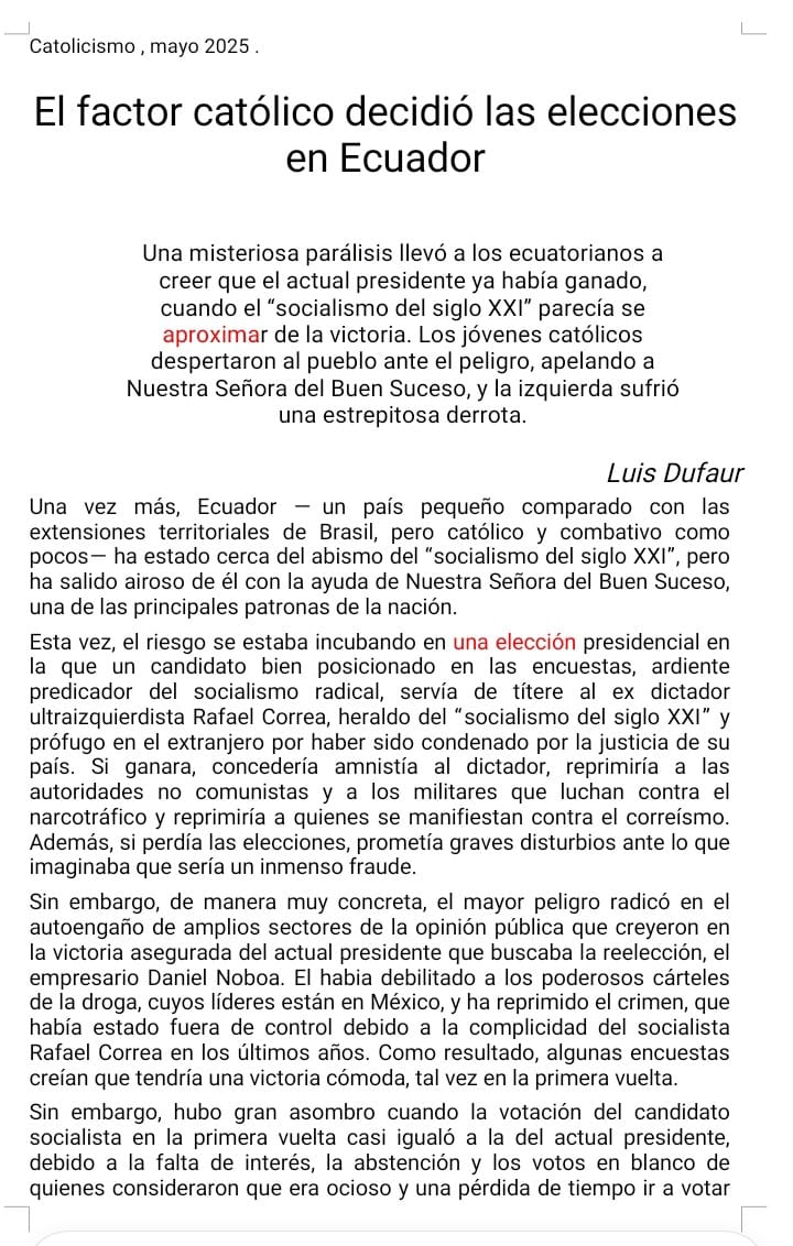 America del sur«Las elecciones en Ecuador parecieron una sorpresa…»Published 6 meses ago on abril 24, 2025By GL Sagrada Imágen de Nuestra Señora del Buen Sucede de Quito EcuadorPerdió la socialista pro comunista del partido de Correa.Vea el relato completo a qué se debió el triunfo de Noboa: Related Topics:Leave a Reply Cancelar la respuestaTu dirección de correo electrónico no será publicada. Los campos obligatorios están marcados con *Comentario * Nombre * Correo electrónico * Web Guarda mi nombre, correo electrónico y web en este navegador para la próxima vez que comente. Δ{{#message}}{{{message}}}{{/message}}{{^message}}Tu envío ha fallado. El servidor respondió con {{status_text}} (código {{status_code}}). Por favor, contacta con el desarrollador del procesador de este formulario para mejorar este mensaje. Más información{{/message}}{{#message}}{{{message}}}{{/message}}{{^message}}Parece que tu envío funcionó correctamente. Aunque el servidor ha respondido correctamente es posible que no se haya procesado el envío. Por favor, contacta con el desarrollador del procesador de este formulario para mejorar este mensaje. Más información{{/message}}Enviando…Top 5Actualidad3 días agoLAS CRUZADAS DE DIOSActualidad4 días agoEl castigo por protestar en las calles cubanas se endureceActualidad4 días ago«La batalla de Lepanto: La guerra que decidió el destino de Europa»Historia4 días agoLa Reina Isabel en su último testamento dijo que los indígenas debían ser hombres libres y muchos nativos estaban esclavizados por otros indígenasNacional4 días agoVer «Gustavo Petro ordenó compartir inteligencia militar con Nicolás Maduro.»Uncategorized4 días agoLas puertas de los cartujos