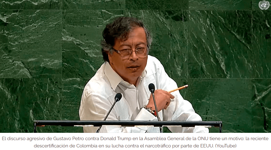 Sin medir las consecuencias para Colombia, Petro pidió en la ONU que se abra «un proceso penal» contra los funcionarios de EEUU involucrados en el hundimiento de embarcaciones con droga en el Caribe, «así se incluya al funcionario mayor que dio la orden, el presidente Trump», a quien incluso se atrevió a comparar con Hitler, en el marco de sus habituales referencias al nazismo. Esta insinuación la hizo luego de asegurar que «los jóvenes asesinados con misiles en el Caribe no eran del Tren de Aragua», contemplando la posibilidad de que entre los fallecidos hubiera colombianos, lo que le permitiría solicitar el mencionado juicio contra el mandatario estadounide