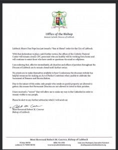 Ordeno, con efectividad inmediata, que todas las iglesias y las oficinas de las parroquias por toda la diócesis de Lubbock permanezcan cerradas hasta nuevo aviso.