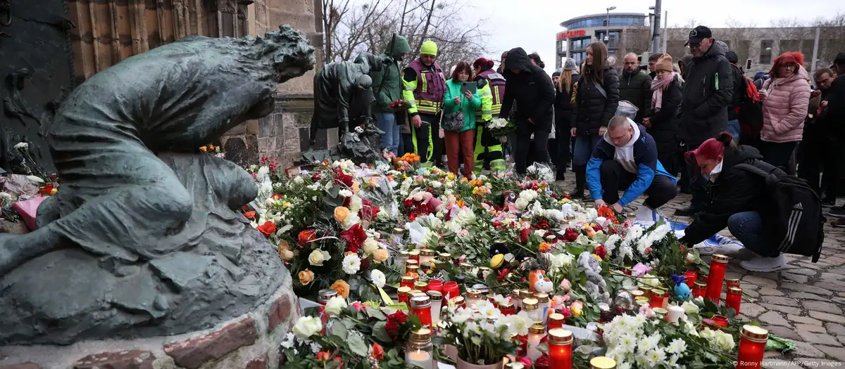 La ciudad luce extrañamente tranquila, quizás paralizada por el estado de shock. En el centro hay periodistas de distintos países, porque está anunciada la visita del canciller Olaf Scholz. Poco antes del mediodía el dirigente camina por el callejón que el atacante convirtió en escena del crimen. Lo acompañan el ministro presidente de Sajonia-Anhalt, Reiner Haseloff (Unión Cristianodemócrata, CDU), la ministra federal del Interior, Nancy Faeser (SPD) y el jefe de la CDU, Friedrich Merz. Todos visten de negro y lucen rostros adustos. Dejan rosas frente a las puertas de la iglesia y permanecen en silencio unos instantes.