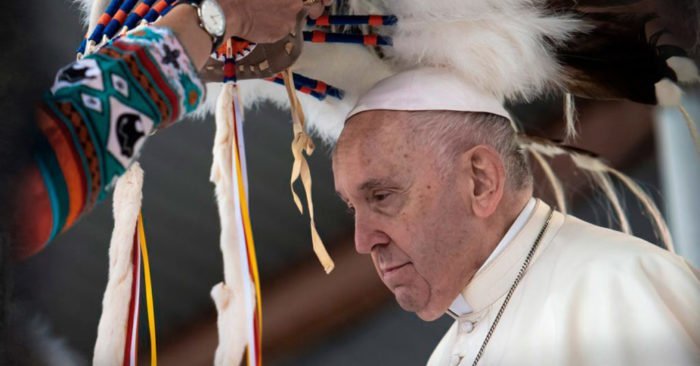 Luego de pronunciar un discurso en el que expresó “profundamente vergüenza y dolor” por el papel desempeñado por los miembros de la Iglesia Católica en los abusos de las escuelas residenciales financiadas por el gobierno, el Papa Francisco se unió a un ritual pagano de “manchar” participando en la práctica indígena, esto en su visita a Quebec durante su cuarto día de actividades en Canadá.