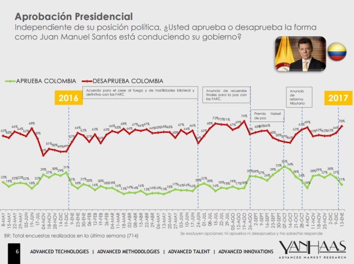 Sigue bajando la aprobación de Juan Manuel Santos El presidente Juan Manuel Santos tiene la desaprobación más grande de la hsitoria de Colombia. Tan solo 2 de cada 10 colombianos piensa que el presidente de Colombia está conduciendo bien al país.