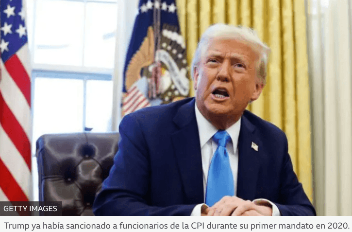 La medida impone restricciones financieras y de visado a las personas y sus familias que colaboren en las investigaciones de la CPI sobre ciudadanos estadounidenses o aliados. Trump firmó la medida mientras el primer ministro israelí, Benjamin Netanyahu, visitaba Washington.