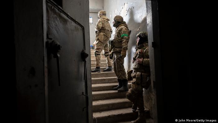 Soldados ucranianos esperan a que cese el ataque para salir del búnker.