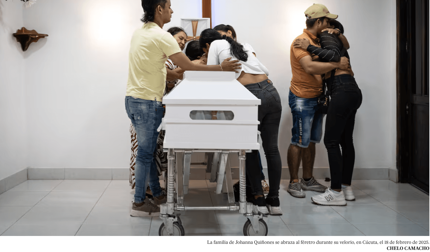 Doña Blanca Parada (Tibú, 49 años) se aferra al féretro blanco como si aún pudiera sostener el cuerpo de la menor de sus hijas. La rodean una decena de familiares. Todos llegaron desplazados hasta Cúcuta, una ciudad fronteriza en el noreste de Colombia, viviendo de refugio en refugio, con la vida en un morral y un par de bolsas. Su hija Johanna Quiñones (Puerto Concha, Venezuela, 18 años) es una de las 64 víctimas mortales de la renovada guerra en la región rural aledaña, conocida como el Catatumbo. Cayó herida el viernes 14 de febrero, con dos balas del fuego cruzado entre guerrilleros del ELN y miembros de la disidencia conocida como Frente 33, que tras una semana de tregua se citaron para enfrentarse a tiros en una carretera que conduce del municipio de Tibú a El Tarra. La casa de los Quiñones, en la vereda Villa del Río, quedó justo en medio de las casi tres horas de combate, entre la vivienda y una escuela infantil.