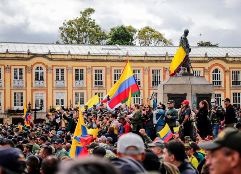 Cientos de militares (r) salieron a la marcha contra el Gobierno Petro en la Plaza de Bolívar de Bogotá pic.twitter.com/wUO7nk3XQm