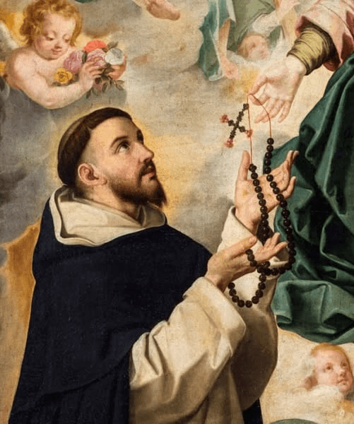 Santo Domingo tenía que dar un sermón en la Iglesia de Notre Dame en París con motivo de la fiesta de San Juan y, antes de hacerlo, rezó el Rosario. La Virgen se le apareció y le dijo que su sermón estaba bien, pero que mejor lo cambiara y le entregó un libro con imágenes, en el cual le explicaba lo mucho que gustaba a Dios el rosario de Avemarías porque le recordaba ciento cincuenta veces el momento en que la humanidad, representada por María, había aceptado a su Hijo como Salvador.